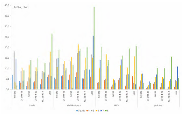 Vidēji (3–8 gadus vecā dārzā) augstākā raža un ražība izmēģinājumā sasniegta šķirnei ‘Lora’ (12.8 t ha-1). Šai šķirnei visaugstākā ražība bija slaidās vārpstas dārza daļā, 7. un 8. gadā pēc stādīšanas attiecīgi sasniedzot 25.6 un 39.3 t ha-1. Hibrīdam DI-93-4-22 ražība bija augstāka (9.1 t ha-1) kā pārējām citām izmēģinājumā iekļautajām šķirnēm un hibrīdiem, t.sk. statistiski nozīmīgi atšķiroties no kontroles šķirnes ‘Aļesja’ (5.6 t ha-1).
