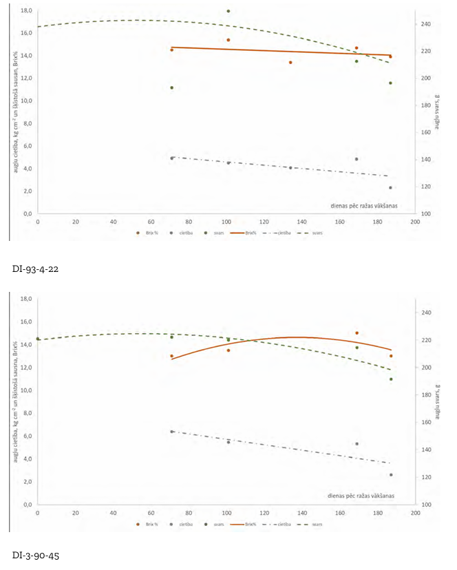 Hibrīda DI-3-90-45 raža 2024. g. tika vākta septembra I dekādes beigās. Atsevišķiem augļiem pēc apmēram trim mēnešiem glabātavā parādījās korķplankumainības pazīmes, norādot uz nepieciešamību pievērst uzmanību kalcija nodrošinājumam augļos. Izteiktāka augļu vīšana un svara zaudēšana šim hibrīdam bija apmēram pēc pieciem mēnešiem, pēc sešiem mēnešiem izteikti zaudējot arī augļu cietību. Šķīstošā sausna augļiem glabātavā, tos noturot divus mēnešus, svārstījās 13.0–15.0 Brix% robežās.