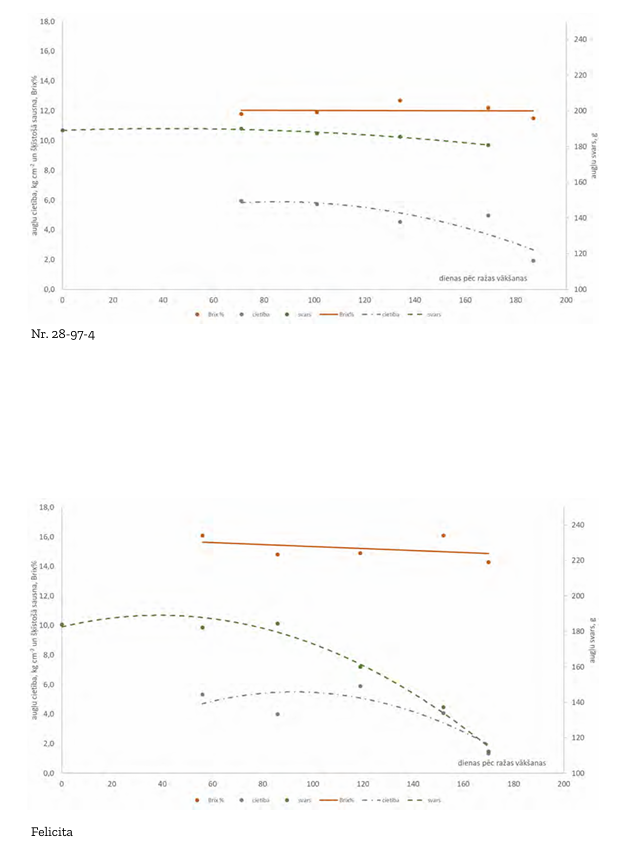 Jaunās šķirnes ‘Felicita’ ražas vākšana tika veikta vēlākos termiņos (septembra pēdējās dekādes vidū), un straujāks augļu svara zudums bija pamanāms jau pēc četriem mēnešiem glabātavā, sekojoši arī nedaudz vēlāk samazinoties augļu blīvumam. Šķirnei raksturīgi salīdzinoši augsti sausnas rādītāji, glabāšanas laikā svārstoties 14.3–16.1 Brix% robežās.