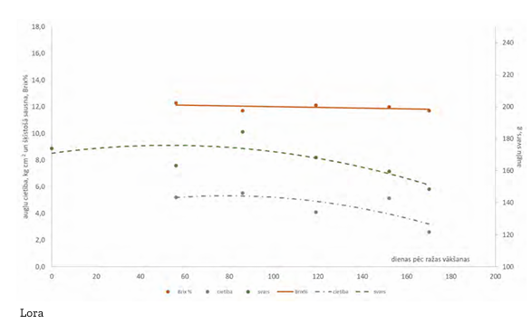 Ražīgās šķirnes ‘Lora’ raža tika vākta septembra III dekādes vidus. Tās augļu izteiktāks svara zudums (vīstot zaudējot ūdeni) vērojams pēc pieciem mēnešiem glabātavā (februāra otra puse), augļu blīvums izteikti mazinājās pēc 170 dienām glabātavā. Šķīstošās sausnas daudzums augļos glabāšanas laikā svārstījās 11.7–12.3 Brix% robežās. Novērots, ka atsevišķiem augļiem pēc trim mēnešiem glabātavā (ap Ziemassvētkiem) parādījās korķplankumainības pazīmes. Februāra beigās (pēc pieciem mēnešiem) uz atsevišķiem augļiem konstatēti augļu puves bojājumi.