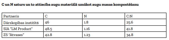 No iegūtajiem augu maisījumiem vispiemērotākā C:N attiecība “noķerta” Dārzkopības institūtā, kas ļoti labi atspoguļojās kompostēšanas procesa sākumposmā, kad temperatūra strauji sasniedza 65 °C temperatūru, un veiksmīgi tika izieta termofīlā fāze, kas ir ļoti būtiska kompostēšanas procesā. Jāsaka gan, ka tas prasīja lielu darbu, kaudzi bieži un regulāri pārjaucot. Pārējiem diviem projekta partneriem, kas arī audzēja augu biomasu, temperatūru bija grūtāk sasniegt nepieciešamajā līmenī, bet cītīgi tika sekots līdzi mitruma līmenim, kas arī palīdz veidot pareizo vidi mikroorganismu darbībai un veiksmīgai procesu norisei. Visu vasaru kaudzes tika regulāri maisītas, mērīta temperatūra, sekots līdzi mitruma līmenim, un rudenī komposts ir jāieziemo. LLKC eksperti apsekoja visus projekta partnerus, lai vienotos, kā veiksmīgi saglabāt izveidoto kompostu un nodrošināt tā briešanai nepieciešamos apstākļus.