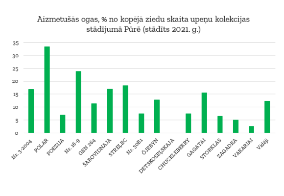 Augu veselības vērtējums veikts arī Dārzkopības institūta Pūres pētījumu centra kolekcijā. Stādījumos no slimībām visizplatītākās bija lapu plankumainības, citu slimību būtiski bojājumi netika novēroti. Kaitēkļu bojājumi kopumā bija maz. Dažās saimniecībās novērota dzinumu iekalšana.
