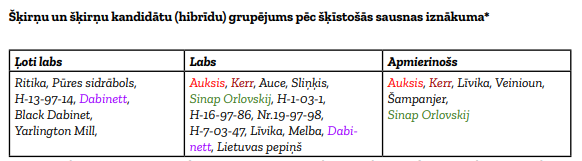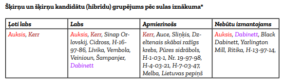 * grupēts tikai pēc 2024.g. ražas datiem; viena un tā pati šķirne var būt atrodama vairākās grupās, ko nosaka dārza vietas ietekme, ražas vākšanas laiks u.c.
