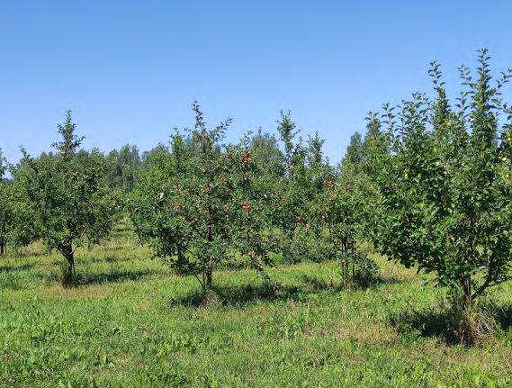 Dominējot liela auguma kokiem, apaugums (zāle) zem kokiem un starp kokiem tiek pļauta vismaz reizi sezonā vecos dārzos uz sēklaudžu potcelmiem, un līdz pat piecām reizēm zāle tiek pļauta salīdzinoši jaunos dārzos, kur izmantoti ābeļu augumu mazinoši potcelmi. Tā, kopumā izmantojot zāles mulčas sistēmu, tiek nodrošināta arī liela bioloģiskā daudzveidība dārzos.